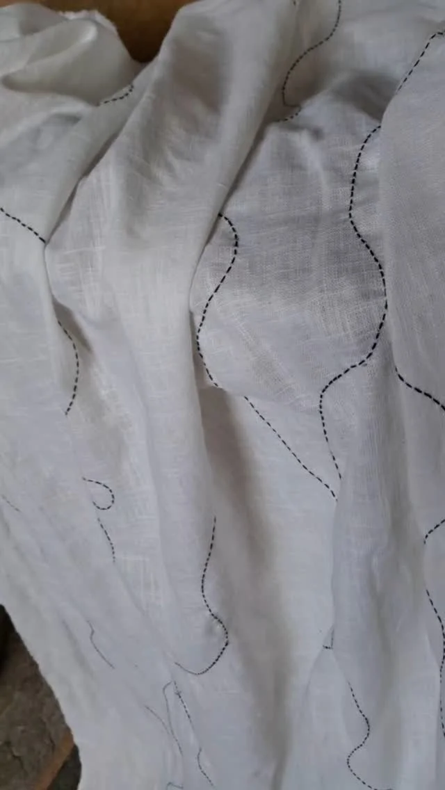 “I have always been interested in the juxtaposition of negative and positive: that of black and white photography, or the wiped plate of the mono print process; the cut block as opposed to the printed positive; the negative of space contrasting with the positive of the shining forms of glass; the negative of the space within white cloth, shaped by the black lines that gather in rhythms to become the forms I draw in thread.”